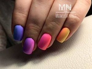 Градиентный маникюр. Подходящий вариант когда долго не можешь выбрать понравившийся оттенок лака. Для этого каждый ноготь покрывается отдельным цветом, с плавным переходом от тёмного к светлому.