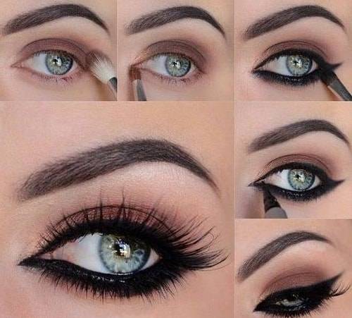 Свой выбор лучше всего остановить на мягких, натуральных оттенках – начиная от бежевого и заканчивая коричневым, и плюс еще черный. Для того, чтобы визуально увеличить глазки можно слегка на верхнее веко нанести черную подводку. Ресницы делаем максимально длинными и объемными, можно воспользоваться накладными, так вы сделаете ваш взгляд эффектным и грациозным.