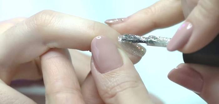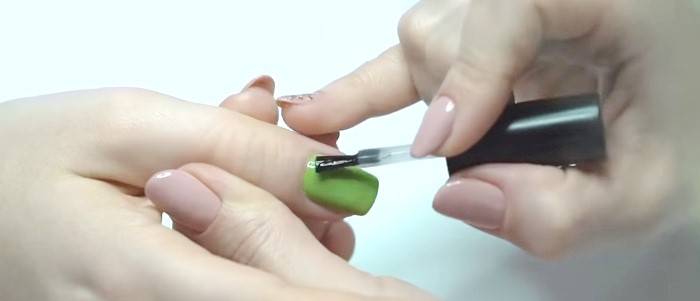 - Только после просушивания одного ногтя можно переходить к следующему. Если делать всю руку сразу, состав начнет расплываться и потеряет форму.
