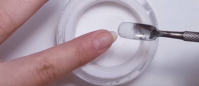 Во втором пудру перемешивают с бесцветным раствором, которым необходимо орудовать быстро, так как он оперативно застывает от контакта с воздухом. Поэтому чаще всего такое решение используется, когда необходимо удлинить ноготь.