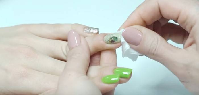 На завершающем этапе проводят снятие липкого слоя и нанесение масла или крема для кутикулы.