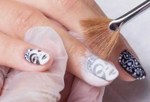 Если приноровиться, то удачно сочетая разные цвета пудры, вы сможете создать сложный рисунок. Например, правильно смешав белый и черный цвета, у вас получится популярный мраморный маникюр.