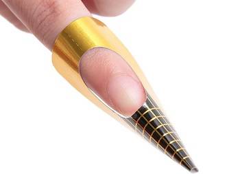 - Форму обрезать под нужную длину и установить. Она надевается под основание ногтя, боковые стороны подгибаются, образуя конус. Форма не должна впиваться в основание ногтевой пластины.