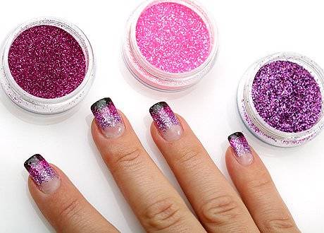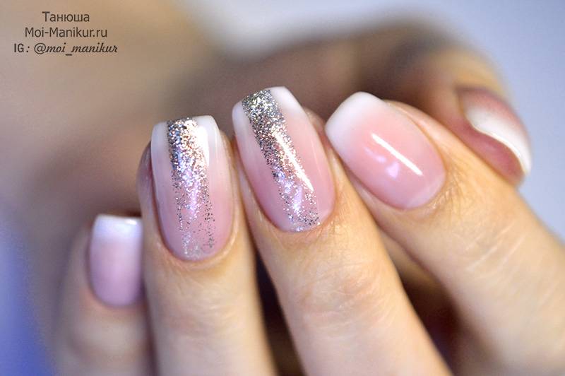 Такой маникюр находится на пике своей популярности, причем выполняется он легко и просто. Помимо стандартных принадлежностей для его осуществления понадобится лак с мелким глиттером.