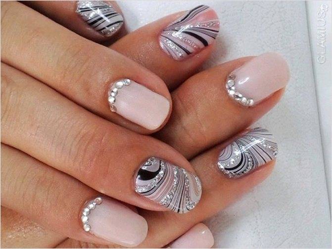 Применение гель-лака совместно с блестками и стразами придает ногтям шикарный вид, который считается достаточным украшением руки. Мастера по дизайну советуют при таком маникюре даже не надевать кольца – руки будут и так достаточно привлекательны и роскошны.