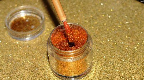 - Палец окунуть в баночку с блестящей пудрой несколько раз.