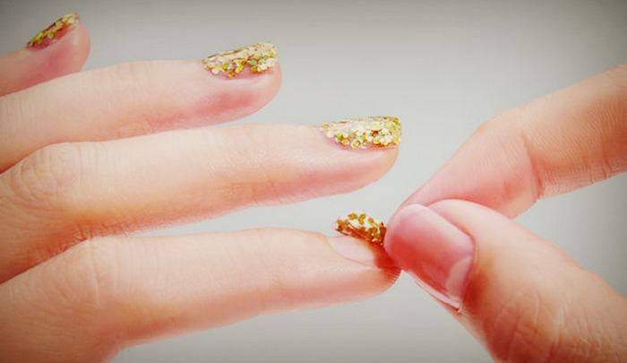 Наносите золотой глиттер в два слоя, так маникюр будет выглядеть аккуратнее