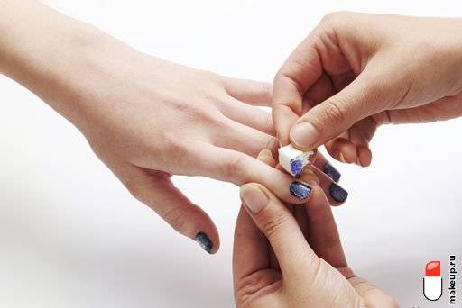 Наберите белый лак на чистый спонж для макияжа и поочередно прикладывайте к ногтевым пластинам. Это поможет создать эффект россыпи звезд, Млечного Пути.