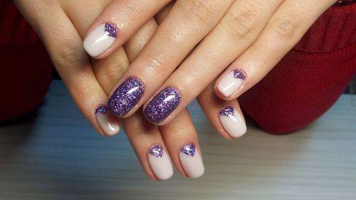Для создания такого маникюра понадобится однотонный лак и лак с шиммером.