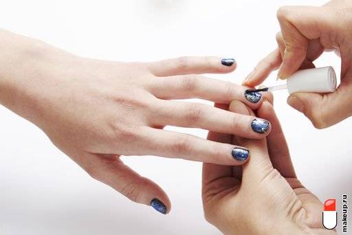 Сначала наносится лак-основа, а когда он засохнет, его покрывают декоративным блестящим слоем.