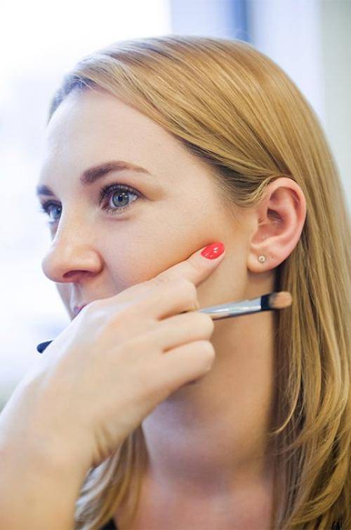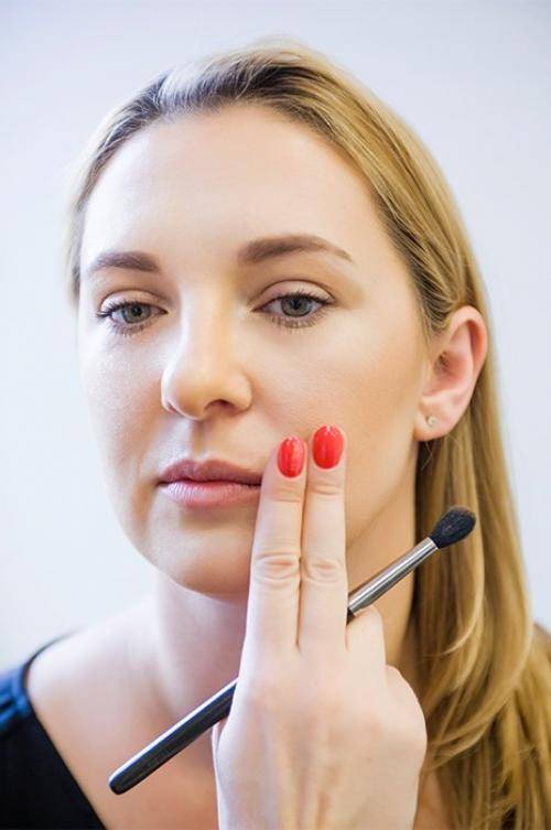 - Чтобы сбалансировать макияж, нужно лёгкими движениями пройтись кистью по носу, лбу, подбородку и скулам.