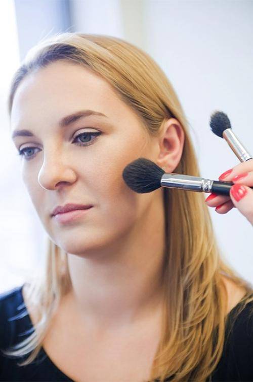 Если будут использоваться рассыпчатые румяна, наноситься они должны только кисточкой, при этом движения должны быть строго в одном направлении.
