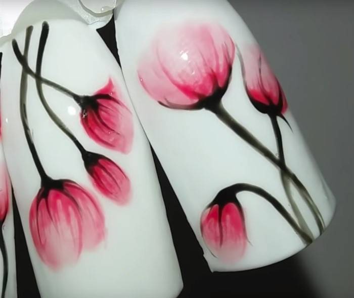 - Наведите очертание чашелистиков и стебельков. Просушите. Нанесите топ.