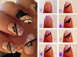 1. Ногти красим основой, а сверху – нейтральным лаком телесного оттенка 2. Верх ногтя наискосок красим сиреневым, светло-красным или розовым цветом. Не трогаем только ногти на безымянных пальцах 3. Между оттенками проводим черную линию 4. Розовый или сиреневый фон украшаем белыми точками. Можно воспользоваться дотсом 5. Снизу, на краю черной полосы, рисуем бантики точно так, как в первом описании, но закрашиваем их внутри белым лаком 6. На безымянных пальцах изображаем часть мордочки мышки Минни: глаз с ресничками. (см. фото) 7. Подсохший рисунок покрываем топом