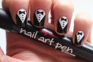 Одеваем ногти в смокинг. Попробуем сделать ироничный дизайн ногтей со смокингом и бабочкой. Для такого наряда нам нужны: 1. Белый и черный лаки, черная акриловая краска 2. Тончайшая кисточка для рисования и дотс