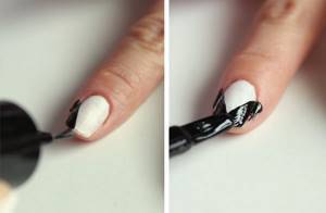Если вы новичок в нейл-арте, то начинать вам нужно с самого простого дизайна ногтей с бантиками. Для начала выберите два контрастных цвета на свой вкус: для френча и банта, затем выполните стандартный маникюр: покройте ноготь бесцветным или телесным лаком-основой, выделите выбранным тёмным цветом френч, дайте покрытию ногтей просохнуть. Теперь можно рассмотреть, как нарисовать бантик на ногтях самым простым способом:
