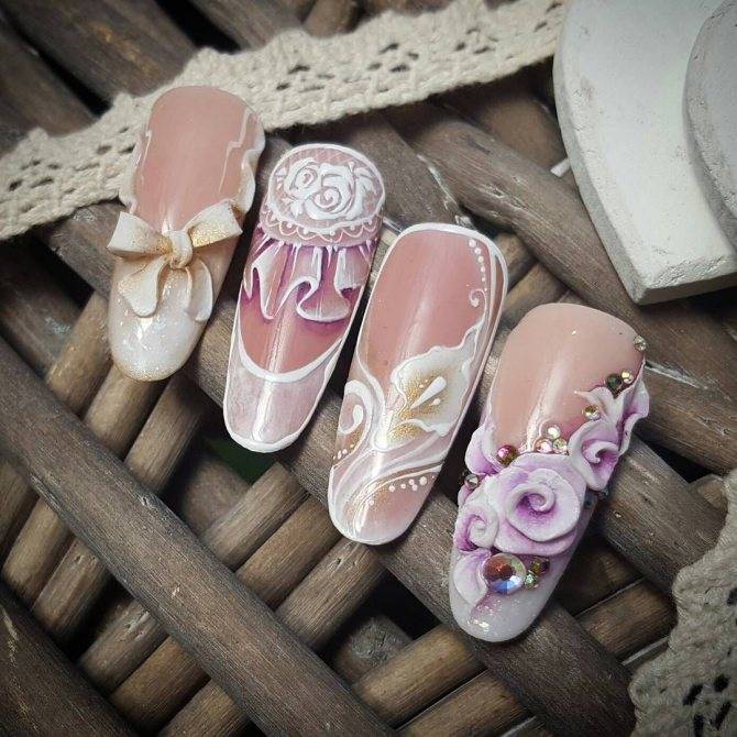 Довольно часто при выполнении свадебного маникюра используют несколько видов декоративных элементов и техник. В этом случае главное не переборщить. Если вы, например, выбрали лепку, то украсьте ей только один ноготь, а остальные дополните стразами и блестками.