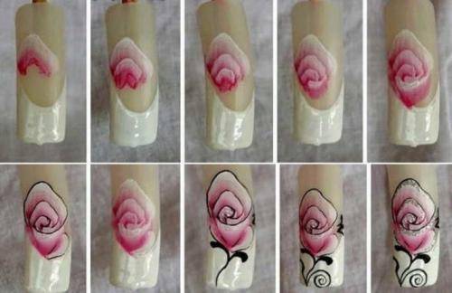 Добавляя более тёмный лак, можно добиться насыщенности оттенка и получить новые варианты цветовой гаммы. При желании выделить контур цветка применяется белая или чёрная краска на гелиевой основе.