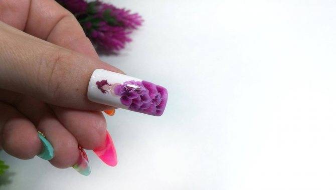 Акварельная техника считается самой скрупулезной и неповторимой среди других техник. Гель-лак с понравившимся оттенком соединяется с топом или базой, после чего изображаются листки цветка или сначала выполняется рисунок гель-лаком.