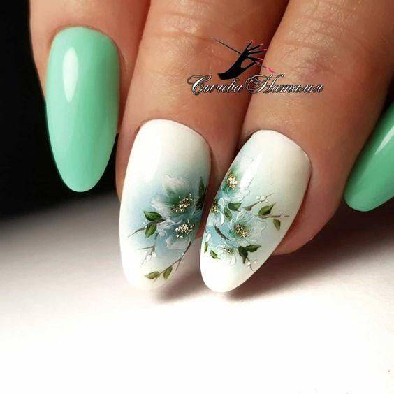 - Далее цветочки тоже хорошо бы оттенить. Для этого можно использовать либо более темный зеленый, либо более светлый. Если отдельно таких цветов нет, то можно исходный разбавить немного с черным или белым гель-лаком на палитре. Добавив блика, отправляем на просушку.