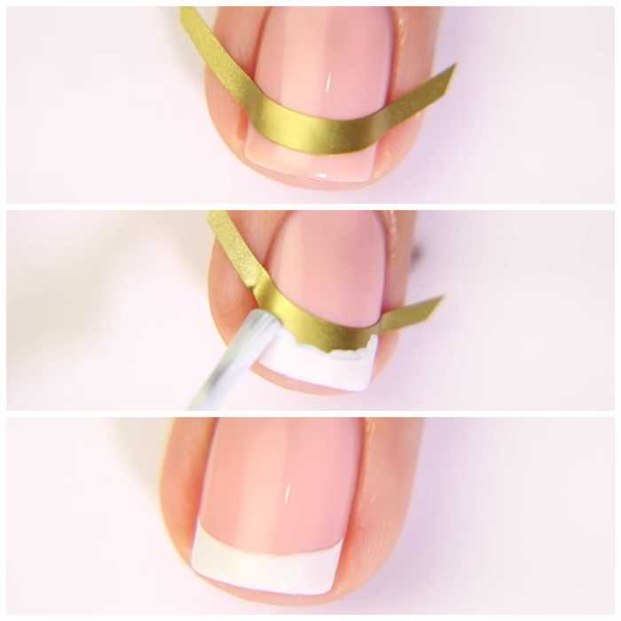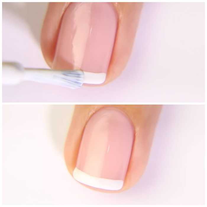 После того как базовый оттенок хорошо подсохнет, можно приступать к следующим шагам. Существует несколько способов, как нанести на кончик ноготка белый лак, мы опишем простые и доступные варианты, которые будут включать в себя и подручные средства.