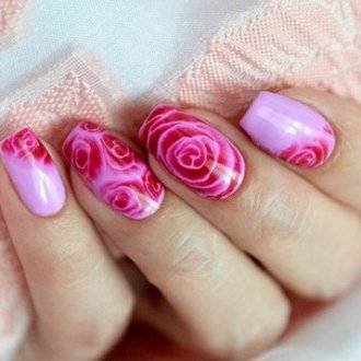 - Рисунок начинаем с бутонов роз. Для этого я использовала кисть для китайской росписи Roubloff. Она плоская и позволяет набрать с палитры с одной стороны красный цвет, со второй белый. Розочка рисуется как обычна спираль из центра по кругу, но благодаря смешиванию цветов получается такой красивый натуралистичный эффект. Цветочки делаем по 3 штучки рядом, чтобы они образовывали мини-букетики. У краев ногтя выглядывают по 2 розочки. Отправляем сушиться в лампу.