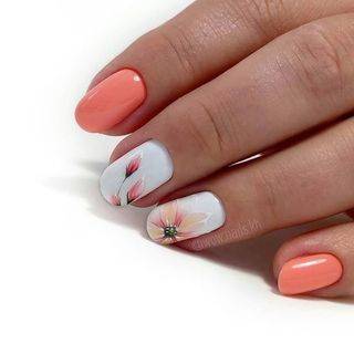 Композиция цветов на 2-х ногтях гель лаком, нарисованная с плавным переходом друг в друга или в виде половинок цветка на двух соседних ногтях, придадут романтичности и женственности. Первый вариант достаточно сложный в выполнении. Вторая техника проста в исполнении и придаст образу оригинальности.