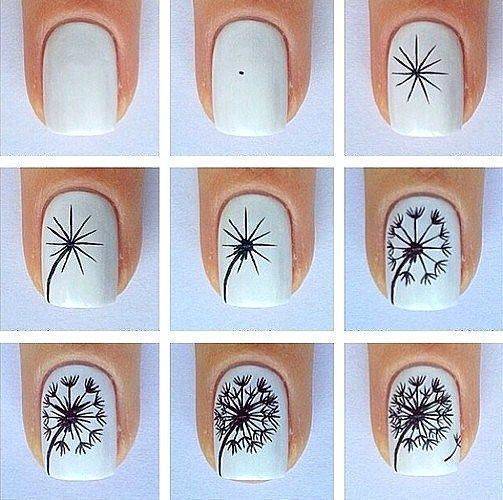 - На просушенном основном фоне черным гель-лаком рисуют тонкую линию. Это ножка будущего цветка. На ее нижнем кончике изображают семечку, на верхнем – точку или небольшой кружок. От второй детали нужно вытянуть несколько прямых линий-лучиков разной длины. Рисунок просушивают. По краям черных лучиков, чуть дальше и до их основания белым цветом делают точки. Они должны образовать круг. Можно добавить местами светлые камифубуки.