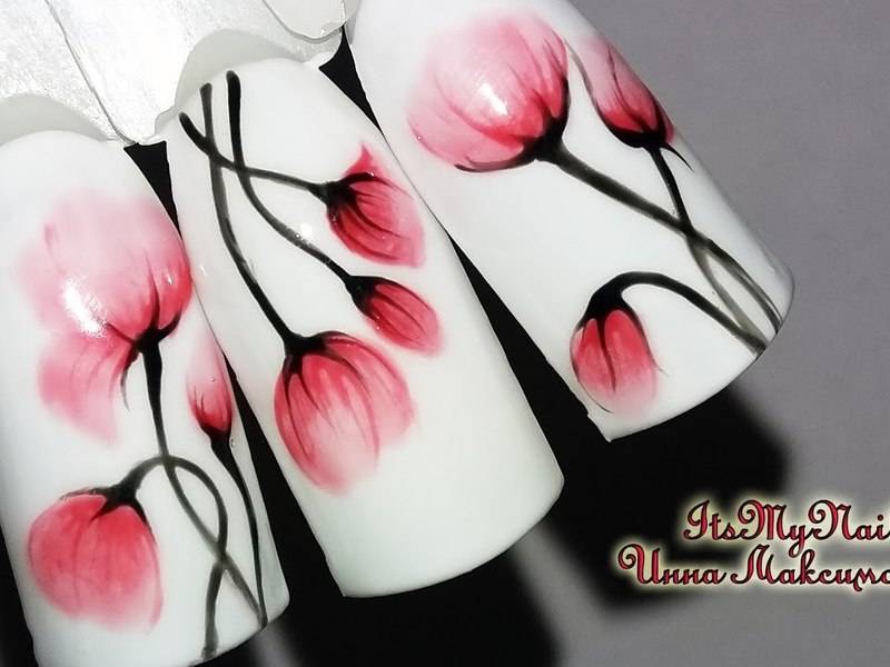 Еще проще нарисовать такие цветы при помощи иголки на мокром лаке. Модные в этом году цветы сакуры, орхидеи.