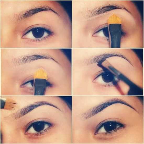 - Наберите на кисть нужное количество теней и приступайте к нанесению. Делать это нужно по росту волос.