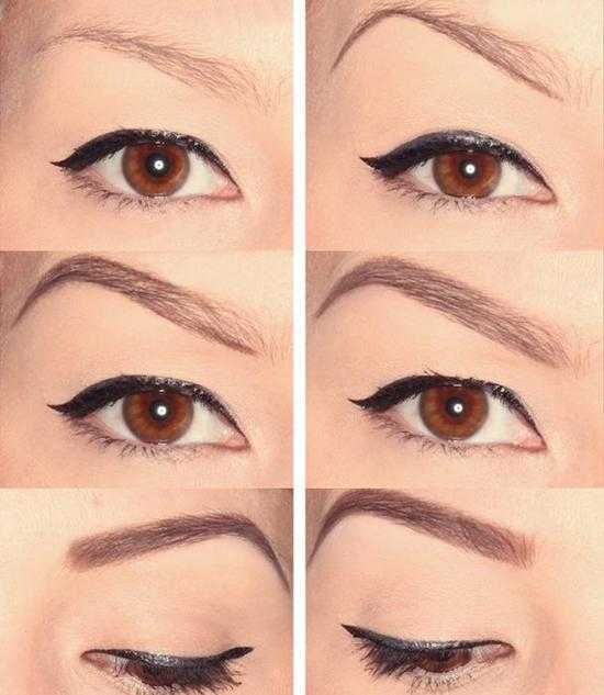 - Можно использовать подводку, но без стрелок. Линия обязательно должна ложиться тонкой полоской от середины глаза и утолщаться к внешней части.