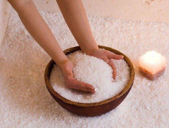 - Солевая ванночка. Используется морская соль, которые нужно взять 2 чайные ложки, также стакан горячей воды. Смешайте компоненты, и в раствор поместите руки на 15 минут. После этого промойте водой, и нанесите на пластинку масло кедрового ореха. Вместо него можно еще использовать какой-либо питательный крем, в частности, подойдёт “Ореховый” крем.