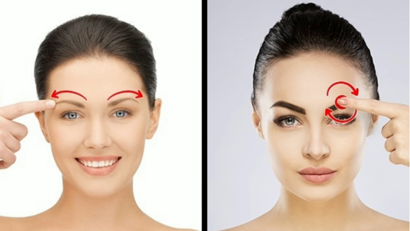 - Приложите средний и указательный пальцы к началу каждой брови. Начните выполнять лёгкие круговые массирующие движения. Повторите 10 раз.