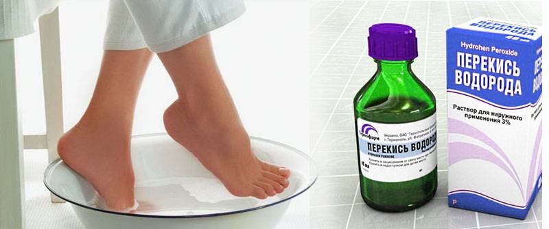 Перекись разводят в воде в пропорции 1:5. В полученном растворе смачивают бинт или марлю и прикладывают к поврежденному участку ступни. Фиксируют данную примочку пищевой пленкой. Длительность процедуры составляет около 8 минут.
