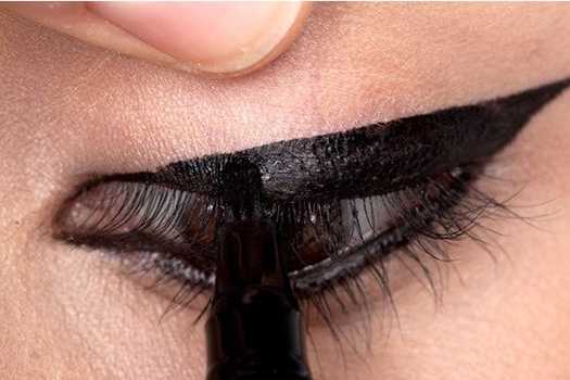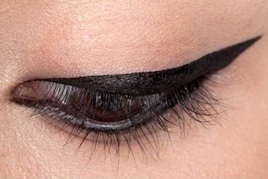 Чтобы крылья были ровными, поставьте точку у внешнего угла каждого глаза, прежде чем использовать жидкую подводку, чтобы стороны совпадали.