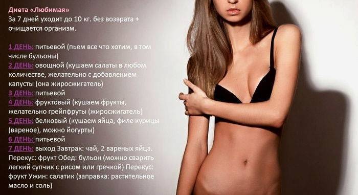 - Семидневная диета «Любимая», соблюдая которую возможно похудеть на 10 кг, монодиета по дням.