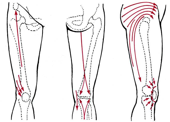 - Сжать кисть в кулак и начать массировать внешнюю поверхность бедра выступающими косточками. Движения круговые, направленные к колену. Сменить ногу и проделать то же самое.