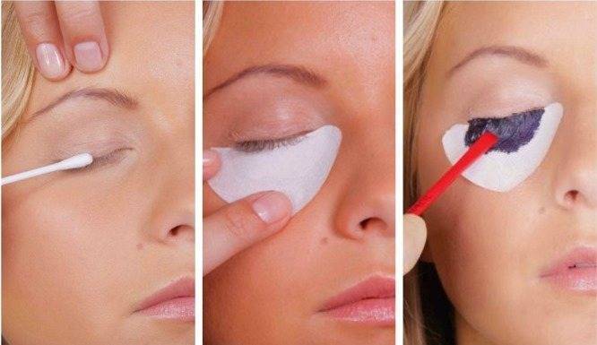 - Под глаза подклеить прокладки так, чтобы ресницы полностью ложились на них. Лучше заклеить нижние ресницы или иначе часть краски может попасть на них, а потом и в глаза.