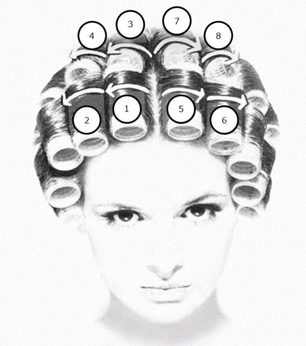 Височные зоны обязательно крутят от лица, а бигуди располагают диагонально, с наклоном верхнего конца к лицу.