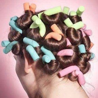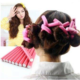 Поролоновые бигуди или папильотки. Они представляют собой гибкую палочку, внутри которой находится проволока. Данный тип позволяет применять их на ночь, тем самым экономить с утра время на укладку прически. Однако их свойство гнуться может навредить, так как ночью папильотка может легко изменить направление локона и испортить вид полученной наутро прически.