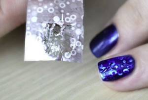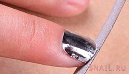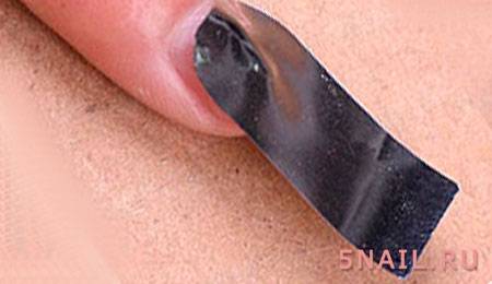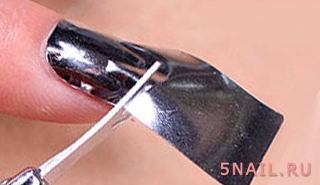 - резко оторвите лист, у вас останется тонкая прозрачная пленка в руках, а фольга на ногте;