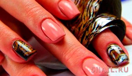 Отрывная фольга более толстая и выпускается в виде стикеров. Крепится она к ноготку тепловым воздействием или с помощью специального клея. Декорировать такой фольгой можно как весь ноготок, так и отдельные его участки в виде узоров, остатки убираются с помощью пилочки.
