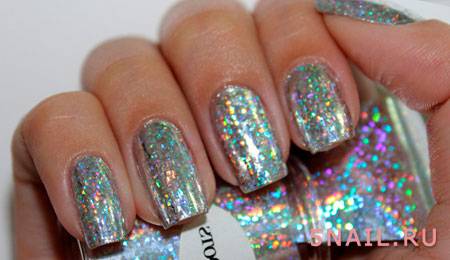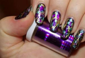 Существует множество видов фольги для ногтей: голографическая, матовая, зеркальная, узорами, с рисунками. В некоторых случаях требуется специальный клей для фольги, который по структуре отличается от клея для ногтей. Наносится он кисточкой, не скалывается, не желтеет и не портит верхнее покрытие. Держать фольгу лучше пинцетом, а разглаживать ватной палочкой. Любая фольга для нейл-арта – хороший способ необычно украсить свои ногти, особенно если подключить фантазию и дополнить все красивой росписью.