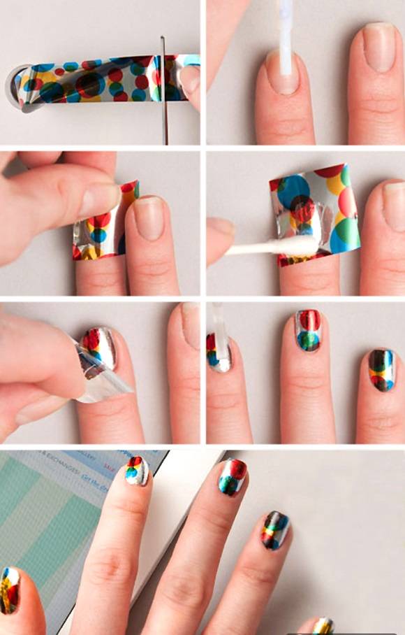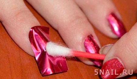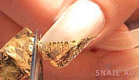 Прежде чем приклеить фольгу, сначала нужно снять прежнее лаковое покрытие, отполировать поверхность ногтевой пластины. Затем подготавливаются под каждый ноготок элементы соответствующей формы и размера