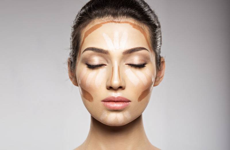 Светло-розовый или беловатый полутона чаще всего применяются в качестве хайлайтера на этапе высветления. Ими выделяют места вдоль скул, под бровями, центр подбородка, височные зоны, носовую косточку.