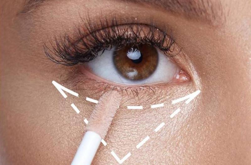 - Нанесите консилер под глаза в виде треугольника. Он должен быть не слишком маленьким.