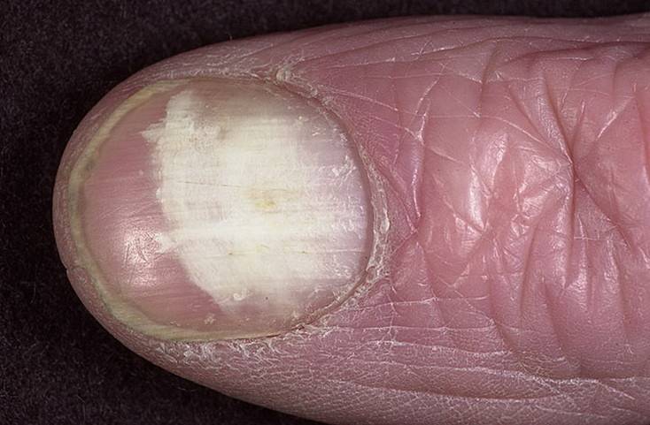| Дерматофиты | Микроорганизмы попадают в роговой слой, из-за этого на ногтях образуются беловатые пятна или желтые полосы, которые со временем разрастаются | ![]() |