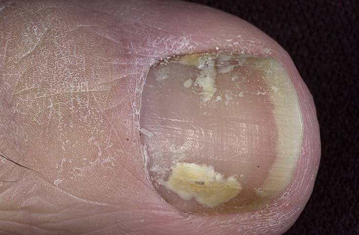 поражается поверхность и глубокие слои ногтя, в основном на ногах