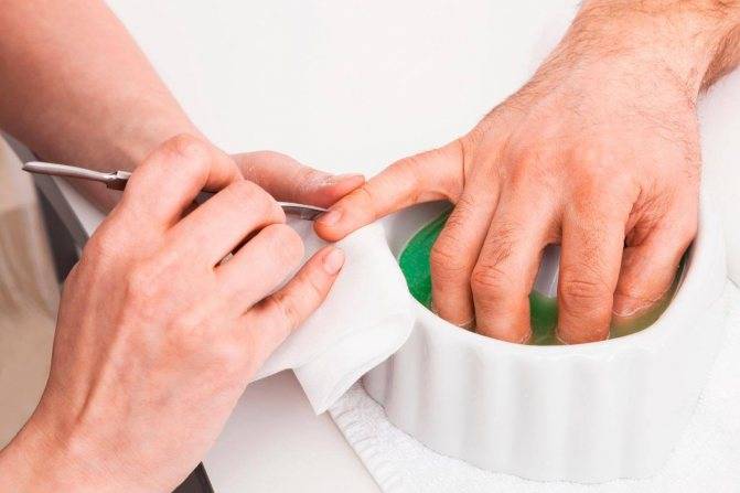 Кожу размягчают, опуская руки в емкость достаточной глубины с подогретым раствором. Продолжительность этой операции — около 15 минут. После размягчения переходят к следующему этапу.Шаг 3. Обработка кутикулы. Кутикулу мужчинам удаляют так же, как и женщинам. Можно сделать как классический маникюр, так и европейский (необрезной). Второй вариант исключает риск травмирования кожи, однако он эффективен, только если кожа вокруг ногтей тонкая. После нанесения специального состава на 2–3 минуты кутикулу отодвигают к основанию ногтя пушером или апельсиновой палочкой, счищают валик. Технология классического (обрезного) мужского маникюра заключается в следующем: на кожу вокруг ногтевой пластины наносят масло для смягчения. Кутикулу отодвигают и срезают специальными ножничками. Таким же образом срезается и кожа на боковых валиках.
