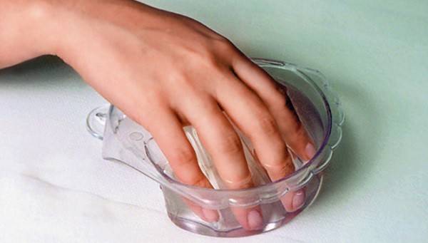 - После этапа пилки необходимо подготовить ванночку. Налить в нее теплую воду и добавить специальные масла. Ванночка нужна для того, чтобы размягчить огрубевшую кожу. Вместо ванночки можно использовать специальные средства для размягчения.